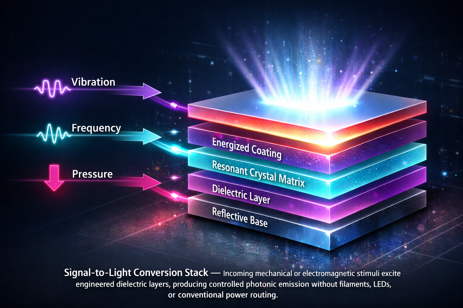 Engineered materials that emit light locally when stimulated by frequency, vibration, or signal input—enabling display and visual feedback without pixels, bulbs, or backlights.