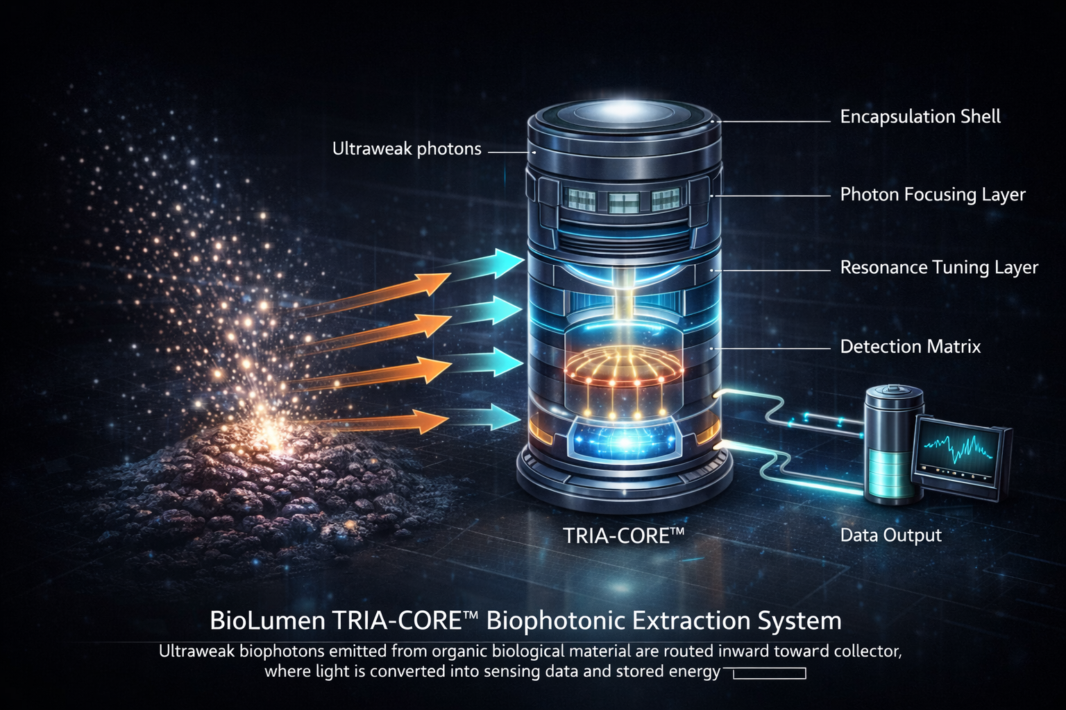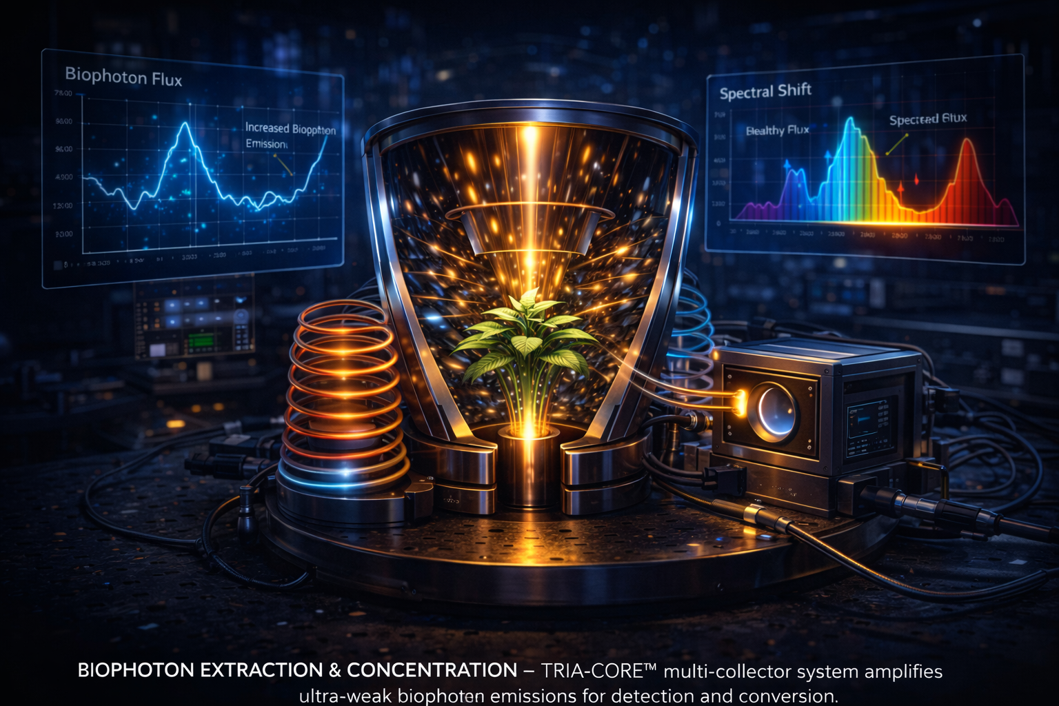 Inward-directed TRIA-CORE™ collector geometry captures ultraweak photon emissions from organic matter.